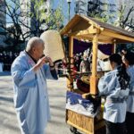 東大島神社お囃子会による獅子舞奉納です。皆様お揃いで頭を噛んでもらいましょう。